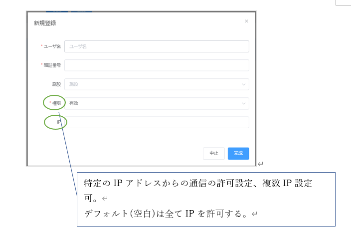 「ユーザ管理」から、「登録」をクリックすると新登録画面が表示され、ユーザ名(ID)と暗証番号(6桁以上パスワード)を設定する。