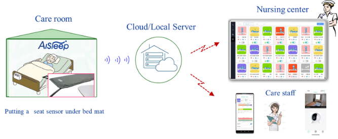 AiSleepはベッドマットの下にセンサを敷くだけで、利用者のバイタル(心拍、呼吸)を計測するほか、眠りパターン及び行動(起き上がり、離床)のリアルタイム情報の見える化により、早期に状態変化を察知し、高速アラートによるお知らせとタイムリーな介助による安心・安全な見守り介護を実現します。