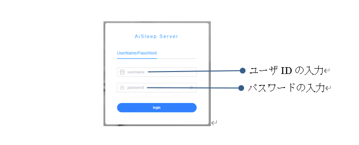 Chromeを起動し、AiSleepサーバーURLまたはIPを入力して、以下の画面より一般ユーザIDとパスワードを入力し、「login」ボタンをクリックするとAiSleepにログインします。