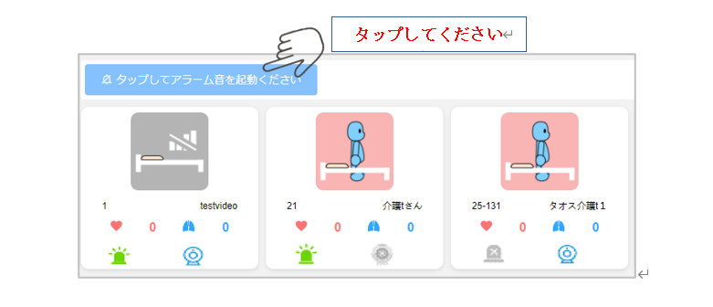 ブラウザーベースのWebアプリ使用した場合、リフレッシュなどの操作により、画面の左上に「タップしてアラーム音を起動ください」というメッセージが現れた場合、アラーム音を発するように、必ずタップしてください。