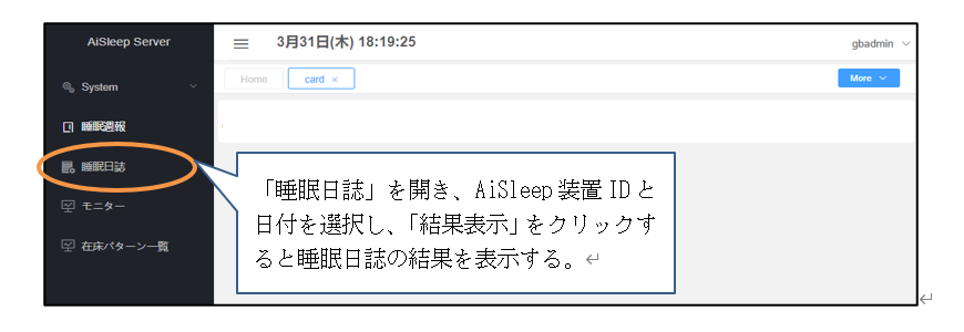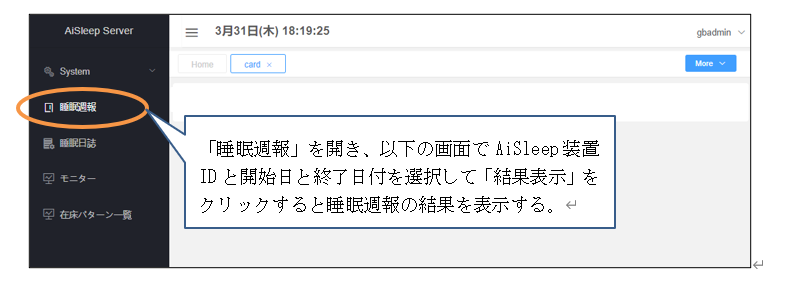利用者と開始と終了日付を選択し、「結果表示」をクリックすると睡眠解析結果を一括表示します。最大過去1ヶ月(31日)間の結果表示が可能です。