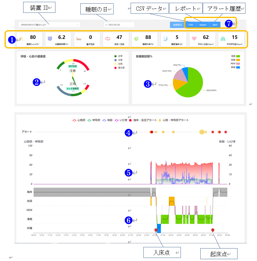 - ❶睡眠解析の結果は以下に示す。睡眠Score、総睡眠時間、離床回数、寝返り回数、睡眠効率、平均心拍数、平均呼吸数