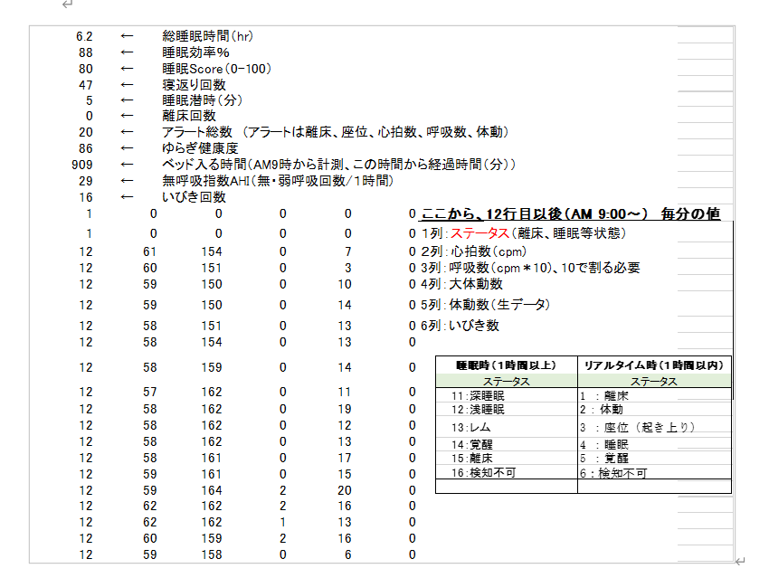 「csv」をクリックすると睡眠解析結果はcsvデータをダウンロードできます。
