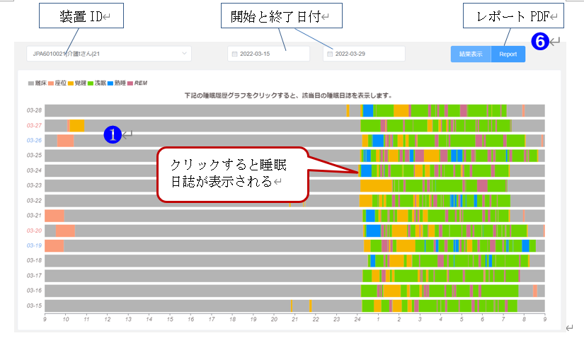 - ❶日別(左側軸)の24時間(8時-翌8時)の睡眠段階をグラフで表示する。