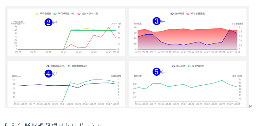 - ❷日別(横軸)で最大睡眠帯における平均心拍数(黄線)と平均呼吸数(緑線)、24時間(8時-翌8時)の離床・座位・心拍数・呼吸数・体動の合計アラート総数(右軸、赤線)