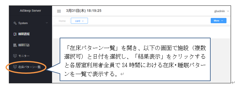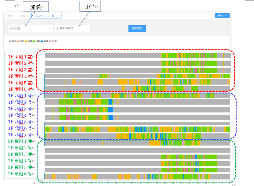 - 介護者の担当ユニット・フロアの利用者の在床・睡眠パターンを一覧で見える化により空間的に一元管理できる。
