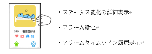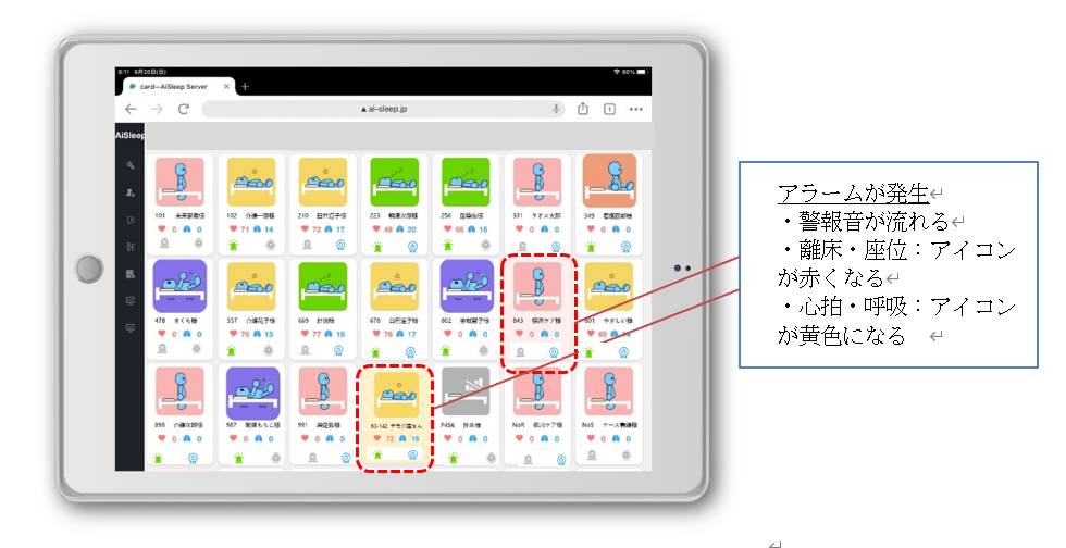 設定によって離床・座位の条件に達したら、アラーム発報でお知らせを行う。アイコンが赤くなり、警報音が流れる。アイコンをタップするとアラームが止まる。