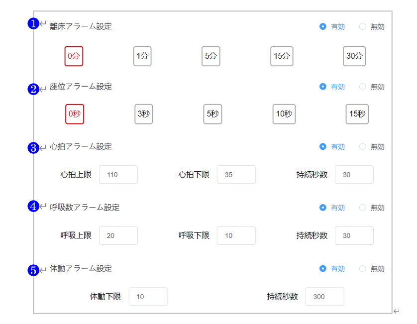 - 一般の場合、利用者ごとに4つのアラーム設定があり、つまり、❶「離床アラーム設定」、❷「座位アラーム設定」、❸「心拍アラーム設定」、❹「呼吸数アラーム設定」。 施設管理画面より個別「装置」メニューから「体動アラーム」に「使用」を選択して設定すると、❺「体動アラーム設定」の追加ができる。