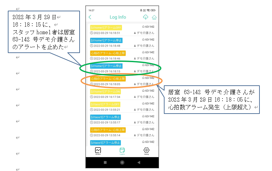 スマートフォンアプリの画面中央の「LogInfo」をクリックすると、アラーム発生と対応(止め)の直近履歴が表示される。(最大40件表示)