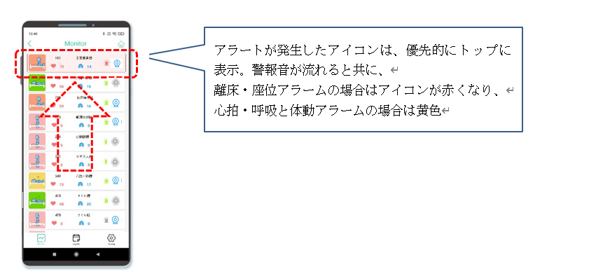 アラートを優先的にトップ表示することで夜間巡視使用中、緊急性の高い利用者の状態をいち早くキャッチでき、速やかに対応できます。