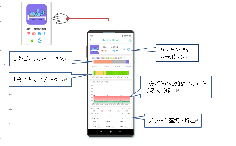 スマートフォンアプリの画面左下「Monitorマーク」でクリックすると、利用者一覧ステータスが表示されます。この画面はリアルタムモニターのデフォルト画面とし、常時に表示してください。1秒ごとに利用者の状態を更新し、一目で利用者の状態を把握できます。